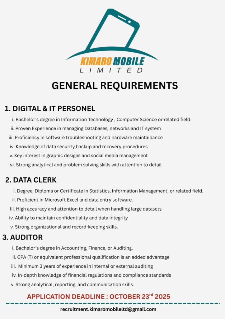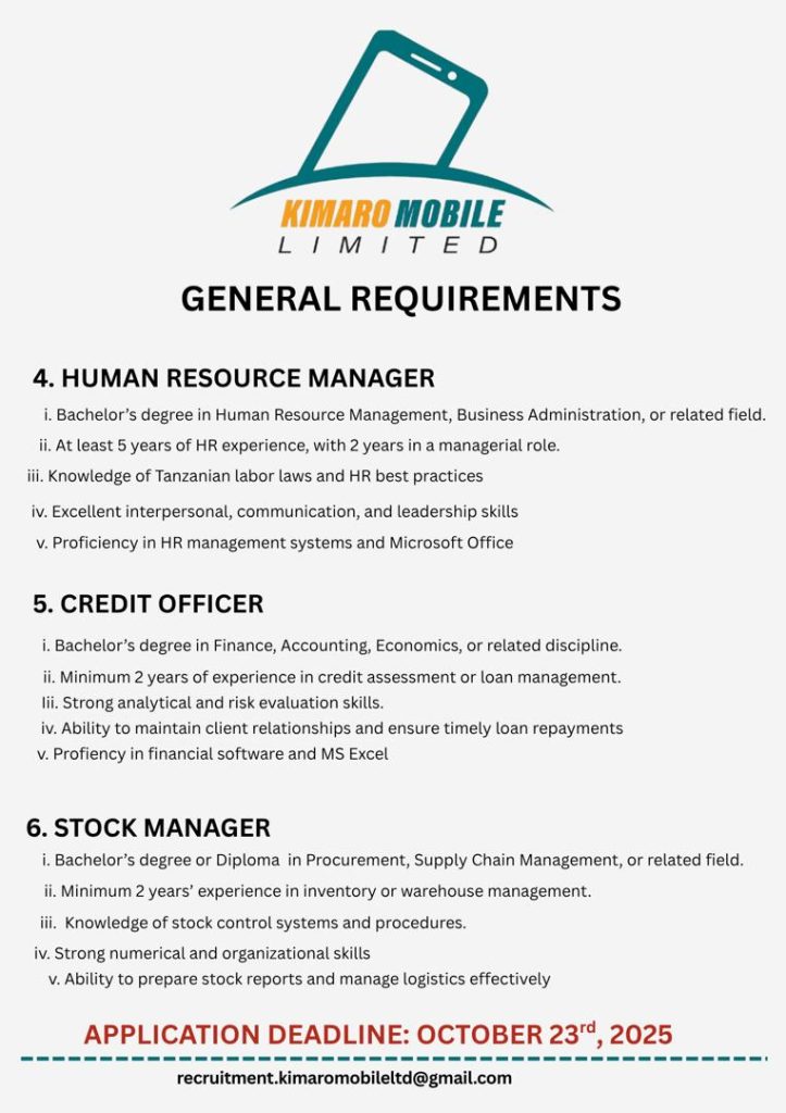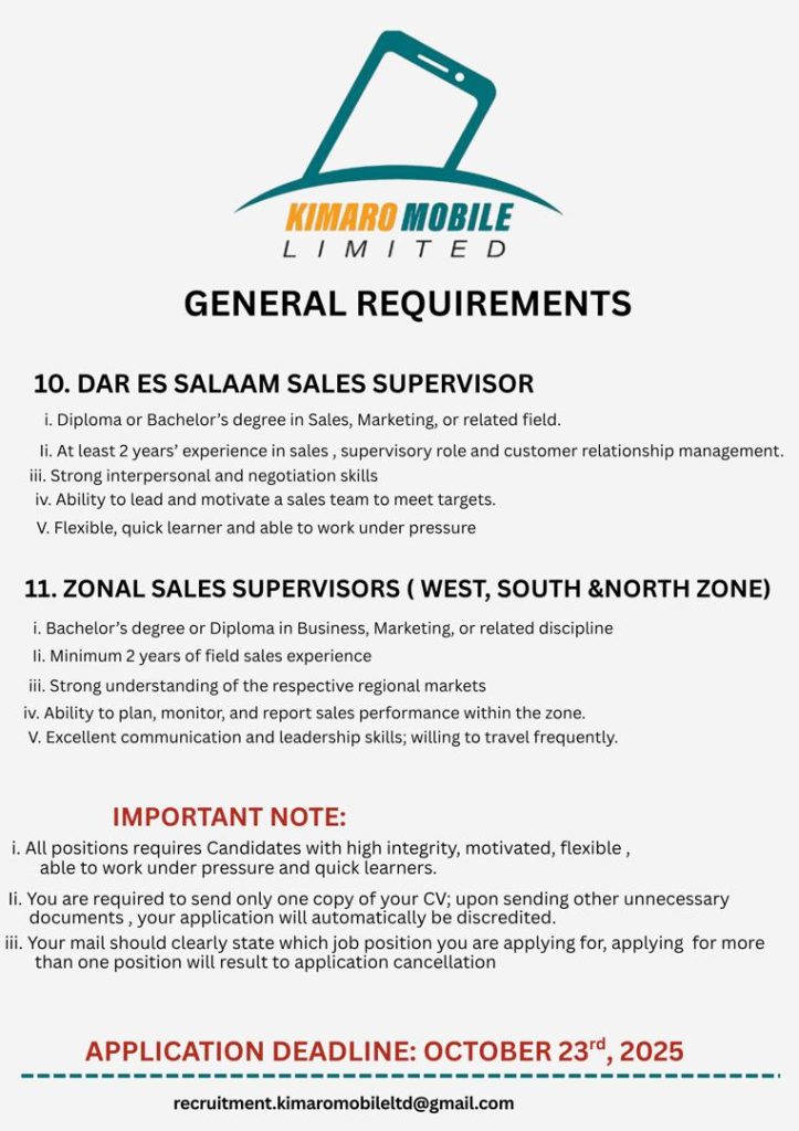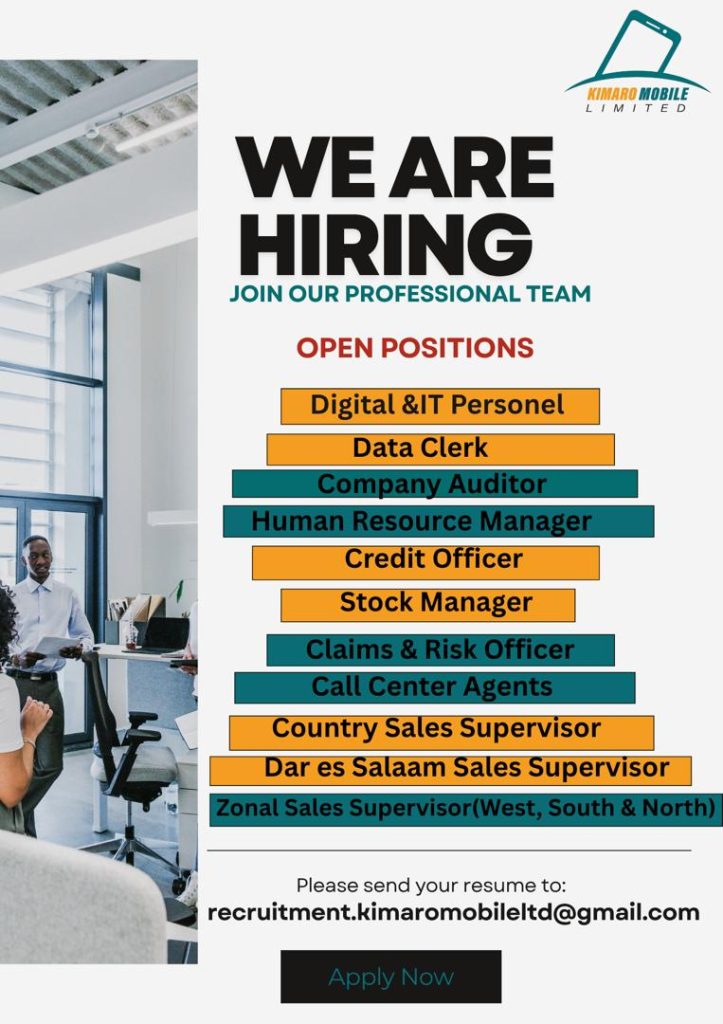 Kimaro Mobile Limited is a fast-growing company committed to making smartphones accessible and affordable for everyone. We specialize in selling mobile phones on credit, offering flexible payment plans to suit our customers’ needs. As we continue to expand, we are looking for sales agents to join our dynamic team. The role involves registering clients into our credit system and ensuring timely delivery of sales orders. If you are motivated, reliable, and ready to grow with us, we’d love to have you on board.